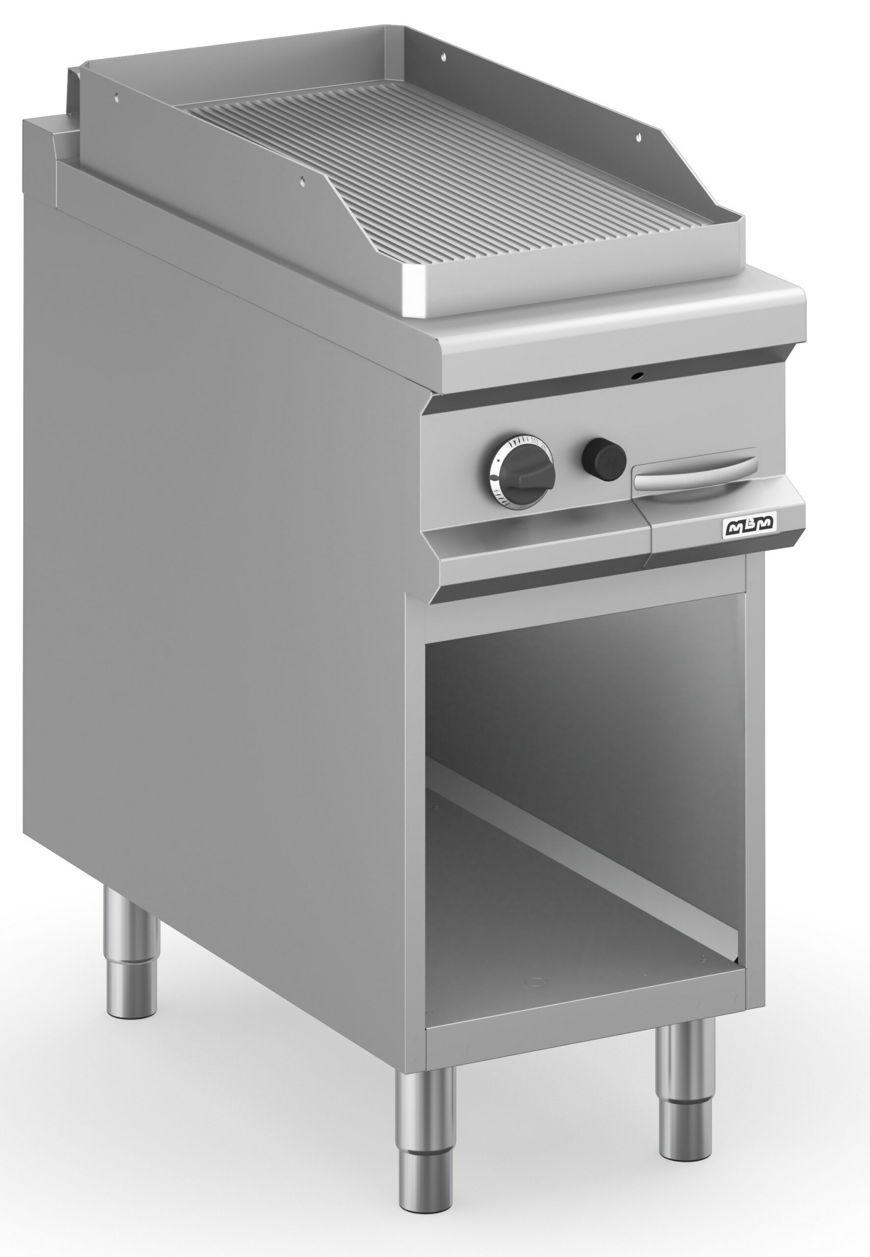 •La placa de cocción totalmente encerrada en la encimera de trabajo está hecha de acero dulce, con acabado pulido o en cromo duro, y tiene espesor de 15 mm.